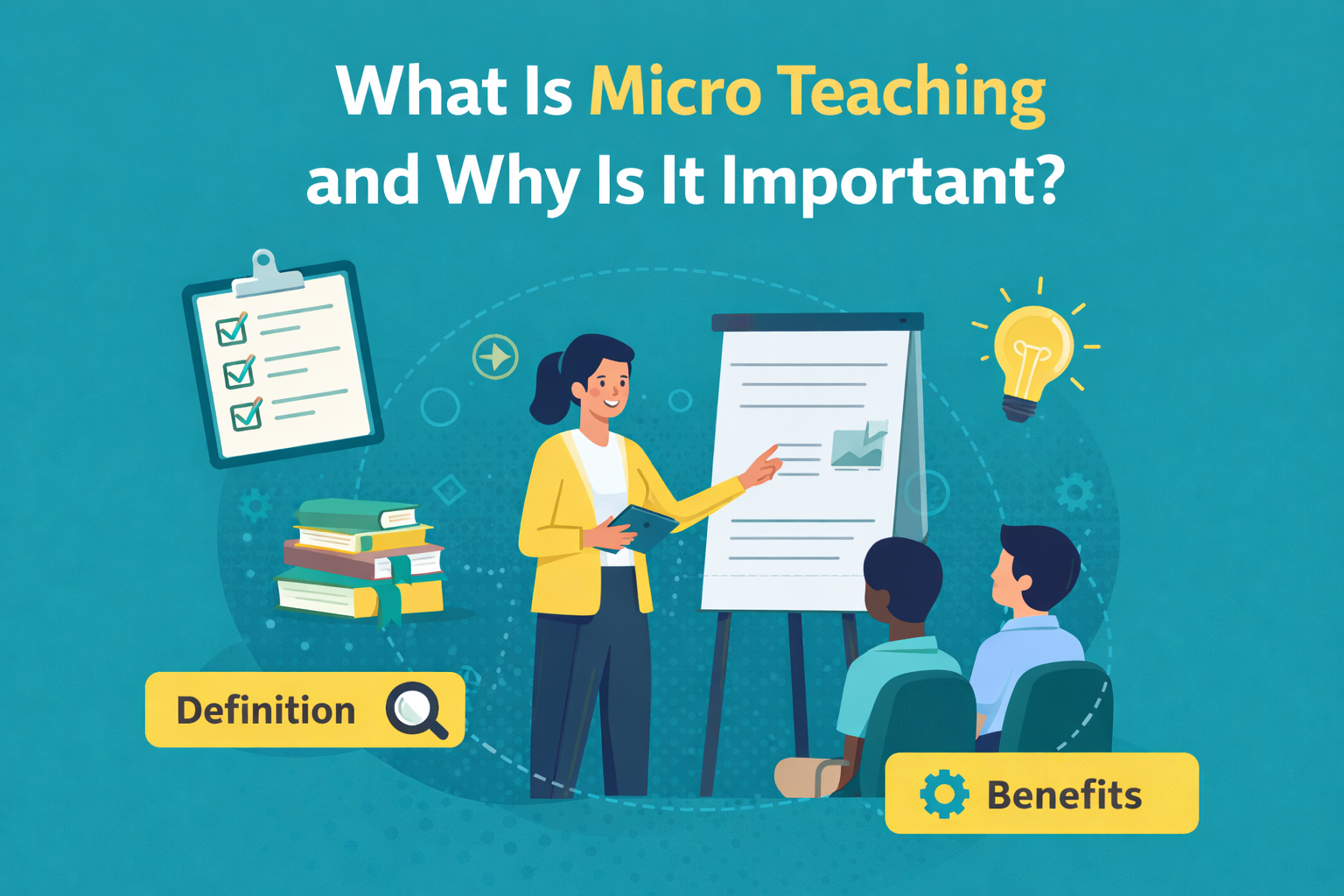 Micro teaching is a teacher training method that breaks the teaching process into small, manageable components. A typical micro-teaching session lasts 5–10 minutes and involves a limited number of students. The teacher focuses on a single teaching skill such as explaining concepts clearly, asking effective questions, or managing classroom interaction.